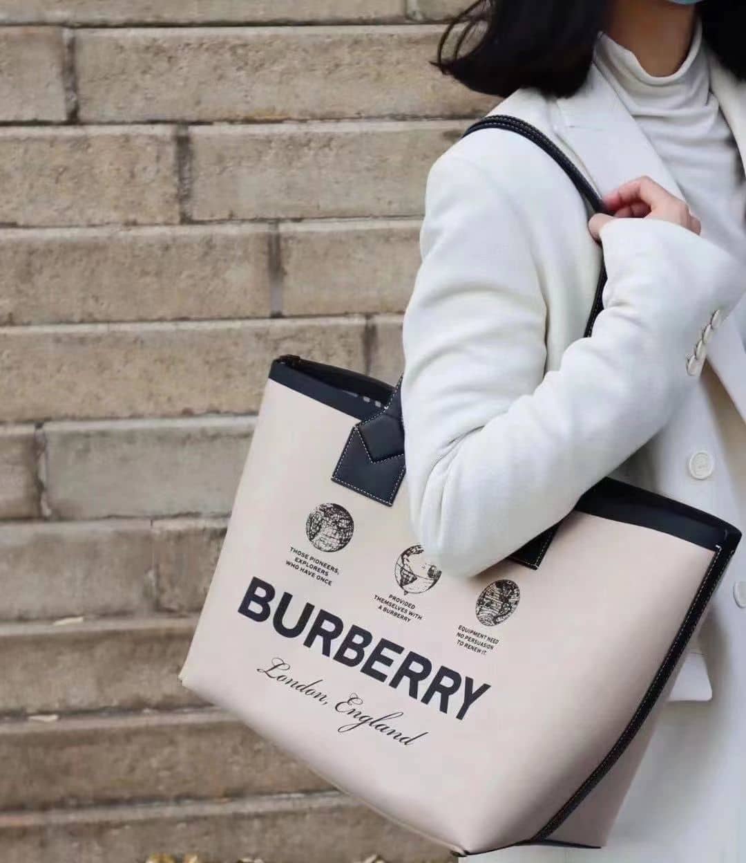 【Burbrrey】ラベルプリント コットン ミディアム ロンドン トートバッグ
